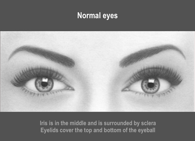 The black of the eye (Iris) is in the middle and is surrounded by.. The white of the eye (sclera) on the right and left